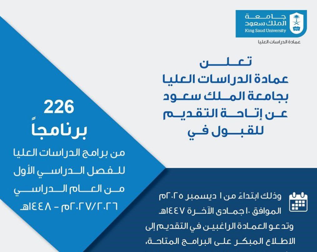 أعلنت جامعة الملك سعود مُمثلة في عمادة الدراسات العليا عن قرب إتاحة التقديم على (226) برنامجاً من برامج الدراسات العليا للفصل الدراسي الأول من العام الدراسي 1448هـ (2026/2027م)، وذلك ابتداءً من 1 ديسمبر 2025م، وذلك وفقاً للتفاصيل الموضحة أدناه.